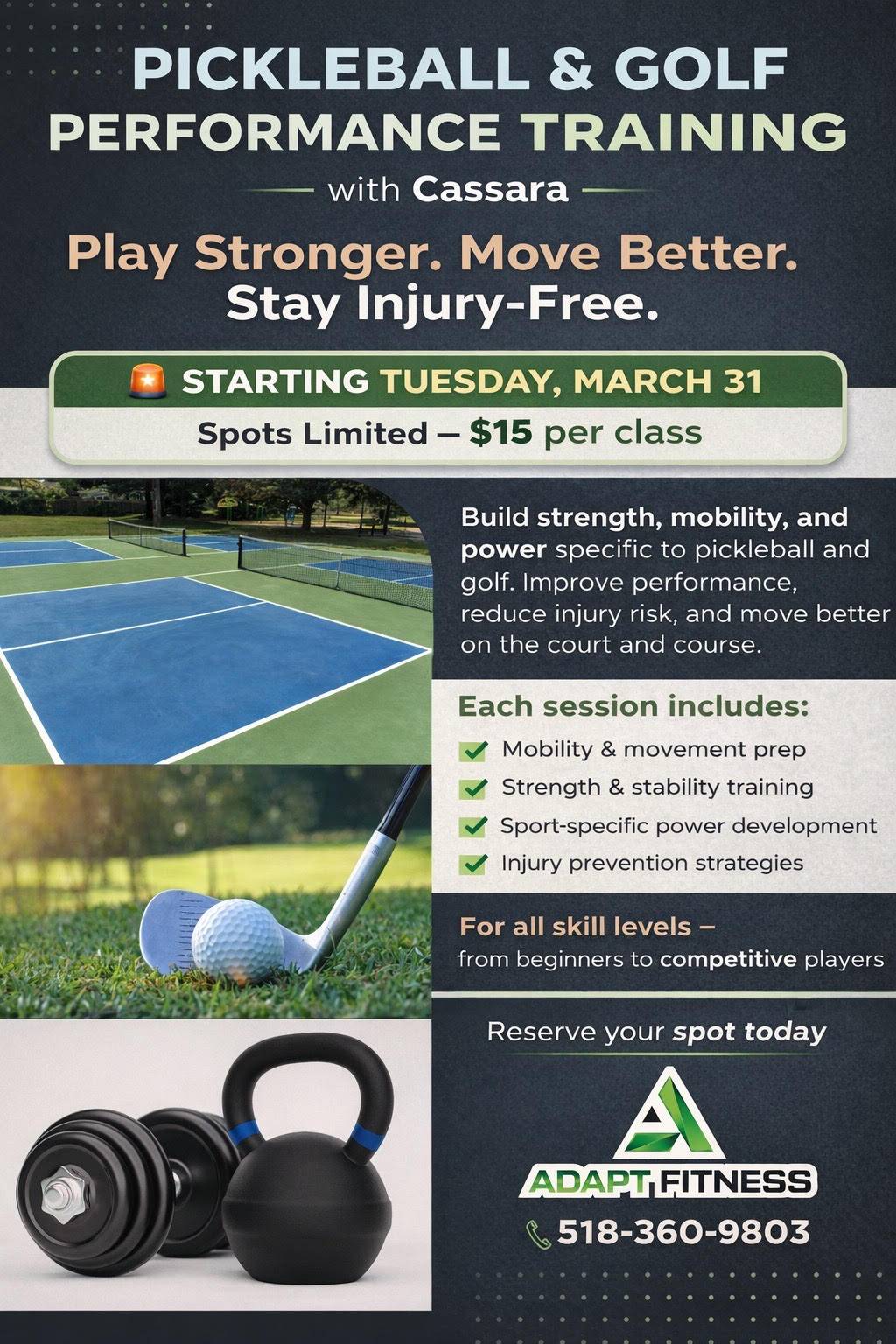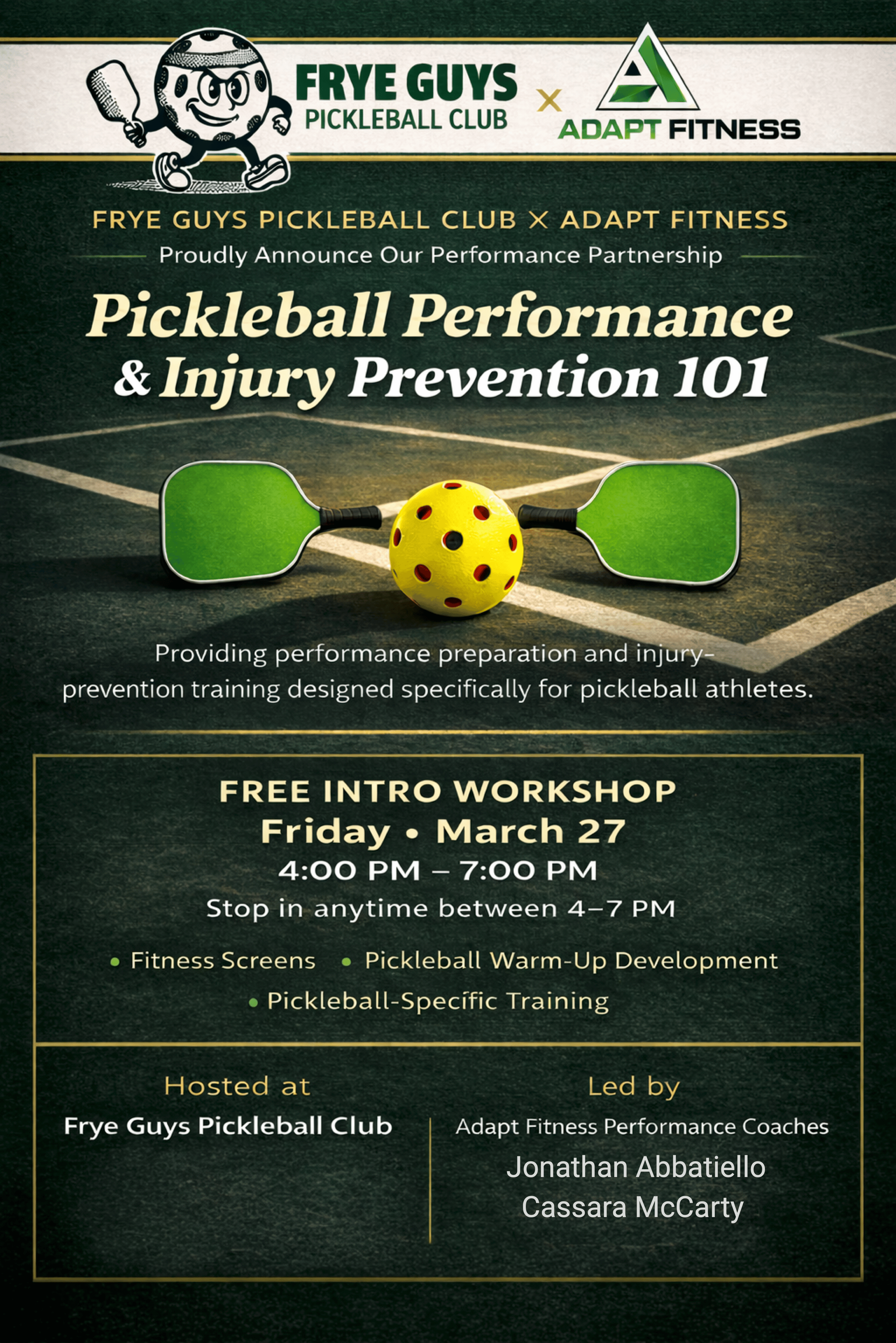 Frye Guys and Adapt Fitness launch pickleball performance programmingA new collaboration between Frye Guys Pickleball Club and Adapt Fitness of Clifton Park is introducing programming focused on performance, movement and injury prevention for pickleball players. A free introductory workshop will be held March 27 at Frye Guys, featuring fitness screenings, warm-up development and pickleball-specific training. The session is led by Jonathan Abbatiello and Cassara McCarty of Adapt Fitness. Adapt Fitness is also launching an ongoing training program beginning March 31, with sessions focused on mobility, strength, stability and sport-specific power development.
