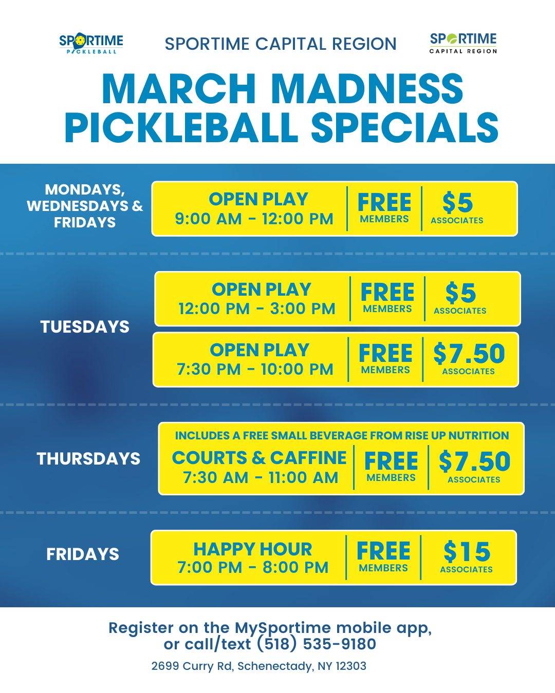 More play equals more entries, with no bracket required to participate. Capital Region bracket challenge with True Pickleball, Lia Auto Group and The BunkerA regional bracket challenge includes prizes ranging from pickleball gift cards to cash, a Big Green Egg grill, a 65-inch TV and a chance to win a 2026 vehicle. https://www.liacars.com/lia-bunker-bracket-challenge Sportime Capital Region March Madness specialsSportime is running themed programming throughout the tournament, including drills, organized play and bracket-style events tied to March Madness. Xtreme March Madness member–guest tournamentXtreme is hosting a multi-week member–guest tournament with round robin play and single-elimination brackets across multiple divisions from March 20 through April 11. https://www.bounce.game/event/e3ae0582-bf77-44d0-97d1-210559254503